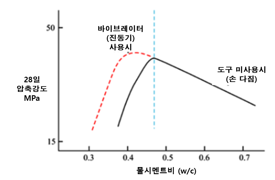 반면 기계로 다짐할 경우 진동기의 진동력을 이용하여 콘크리트 내부의 입자를 밀어서 타설시 혼입된 내부 공기를 효과적으로 제거할 수 있으며, 일정한 힘의 방향으로 다짐하기 때문에 일관된 강도를 유지할 수 있습니다. 아래는 손다짐시와 비교한 콘크리트 압축강도의 변화에 대한 연구결과 그래프입니다.